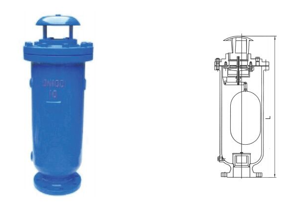 管內污水在運作時,該閥活瓣停在定位架下部,進行大量排氣,當空氣排完時,污水進入閥內,球浮起,傳動活瓣到關閉,停止排氣。管內在運作時會自然產生少量氣體,這些氣體會集中到管內上部,到相當程度,閥內污水下降,浮球順水下降,氣從小孔排出。如出現停電、停泵,管內水流空時隨時出現負壓,浮球順水下降,打開小孔帶動大孔進行大量補氣,確保管道安全。