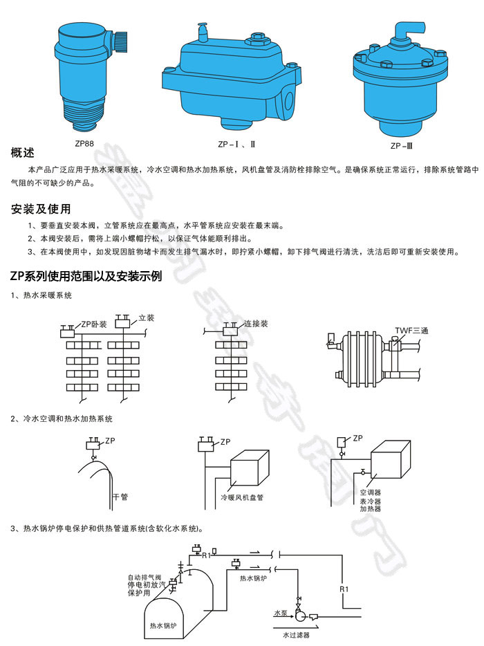 ZP-I、II方形臥式自動排氣閥廣泛應(yīng)用于熱水采暖系統(tǒng),冷水空調(diào)和熱水加熱系統(tǒng),風(fēng)機(jī)盤管及消防栓排除空氣。是確保系統(tǒng)正常運(yùn)行,排除系統(tǒng)管路中氣阻的不可缺少的產(chǎn)品。